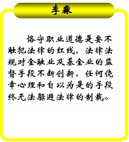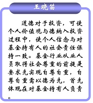 正所謂“德者,才之帥也”,基金從業(yè)人員的平均學(xué)歷之高在全國各大行業(yè)中屈指可數(shù),名牌大學(xué)博士碩士比比皆是,“才”不可謂不高。然而,如何更好地以“德”馭“才”,真正做到“德才兼?zhèn)洹?,是目前基金業(yè)人才發(fā)展中面臨的桎梏之一。通過上海市基金同業(yè)公會舉辦的第一期職業(yè)道德培訓(xùn)班,參訓(xùn)的從業(yè)人員對于“職業(yè)道德”這四個字有了更深刻的理解和感悟。為展示培訓(xùn)成果,公會精選了近百位學(xué)員的職業(yè)道德感言供廣大基金從業(yè)人員借鑒(按基金公司拼音首字母排序)。