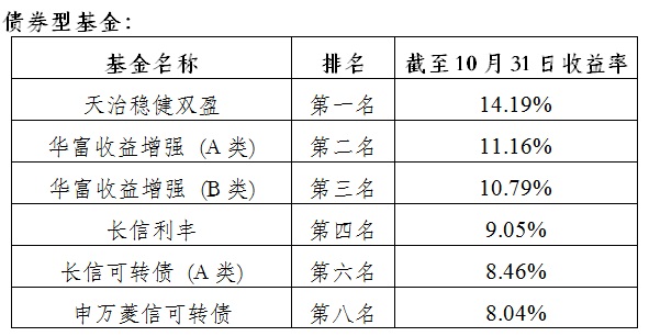 公會(huì)對(duì)上?;鸸窘衲暌詠?lái)截至10月31日各類(lèi)型基金的排名情況進(jìn)行了觀察。上?;鸸驹趥秃捅1拘突饦I(yè)績(jī)上持續(xù)表現(xiàn)優(yōu)異。天治穩(wěn)健雙盈債券基金穩(wěn)坐同類(lèi)別基金頭把交椅,富國(guó)中小盤(pán)基金十月收益頗佳,重回QDII型基金榜首。具體排名如下: