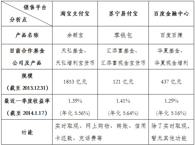 首先,從產(chǎn)品的功能上看,除7*24小時實(shí)時取現(xiàn)外,最為廣泛的當(dāng)屬支付寶,其“余額寶”內(nèi)資金可實(shí)時用于網(wǎng)上購物、轉(zhuǎn)賬、信用卡還款、充話費(fèi),也可以轉(zhuǎn)回到支付寶賬戶余額或銀行卡;其次為蘇寧易購的易付寶,其“零錢包”在功能上幾乎等同于支付寶,但其第三方支付平臺易付寶在支付渠道的認(rèn)證上沒有支付寶廣泛;百度相關(guān)渠道產(chǎn)品,除了實(shí)時取現(xiàn)功能外,沒有支付和還款等增值服務(wù)功能,僅為代理銷售平臺。