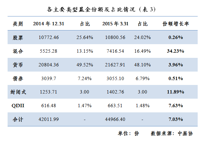 2)2015年第1季度,混合型基金市場(chǎng)規(guī)模和份額增長(zhǎng)率最快,分別達(dá)54.43%和34.23%;同時(shí),市場(chǎng)占比分別凈增4.6%和2.93%;股票型基金規(guī)模增長(zhǎng)率僅次于混合型基金,達(dá)20.27%,但份額增長(zhǎng)率僅0.26%;同時(shí)規(guī)模占比凈增1.21%,但份額占比卻下降1.62%,說明在國(guó)內(nèi)股票市場(chǎng)上漲的同時(shí),股票型基金份額呈現(xiàn)凈贖回狀態(tài);債券基金、貨幣基金規(guī)模和份額增速較慢;QDII基金和封閉基金規(guī)模和份額也出現(xiàn)一定增長(zhǎng),但相應(yīng)占比仍然較低。