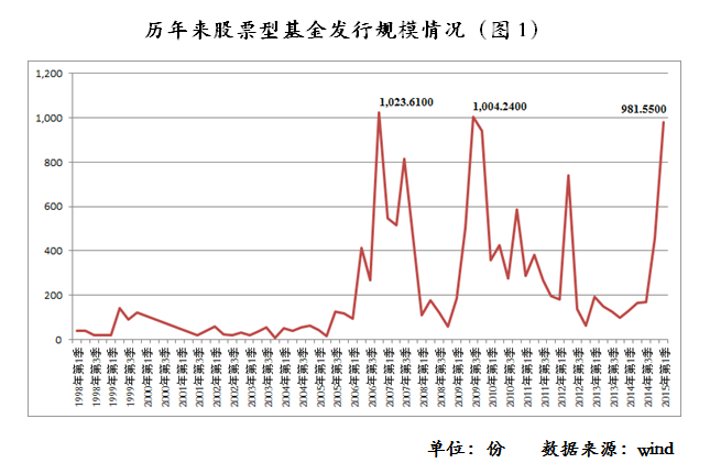 2015年第1季度,從發(fā)行份額上來看,混合型基金發(fā)行規(guī)模最多,達(dá)到1189.63億份,其次是股票型基金981.55億份,貨幣型和債券型基金發(fā)行較少?;旌闲突鸺径劝l(fā)行額處于歷史最高峰,股票型基金季度發(fā)行額也接近歷史高點(diǎn)。