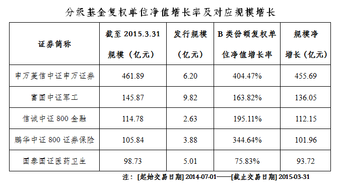 自2014年7月1日至2015年3月31日,結(jié)構(gòu)化行情催生行業(yè)分級(jí)基金份額突飛猛進(jìn),以證券板塊為代表的結(jié)構(gòu)化上漲行情帶動(dòng)相關(guān)主題分級(jí)基份額急劇膨脹。從相關(guān)數(shù)據(jù)來(lái)看,行業(yè)和主題切入市場(chǎng)階段性熱點(diǎn)的分級(jí)基金,其B類(lèi)份額凈值增長(zhǎng)率和規(guī)模增長(zhǎng)都有較佳表現(xiàn)。圖為2014年7月1日前成立的規(guī)模排名前五的分級(jí)基金B(yǎng)類(lèi)份額單位凈值增長(zhǎng)率與對(duì)應(yīng)整體基金份額表。