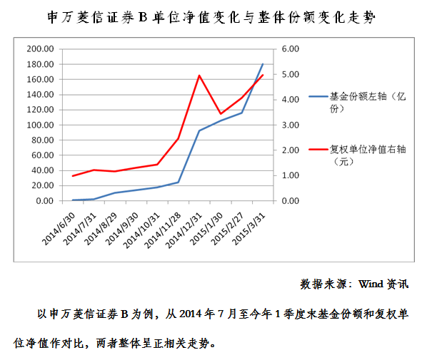 在這輪單邊上漲行情中,部分基金公司借助分級(jí)基金在杠桿牛市中資產(chǎn)規(guī)模急劇膨脹,也為高風(fēng)險(xiǎn)承受能力投資者帶來(lái)了撬動(dòng)更高收益的工具。但值得注意的是,弱市場(chǎng)轉(zhuǎn)熊或行業(yè)出現(xiàn)分化,各種行業(yè)、主題的分級(jí)基金可能會(huì)重回牛市前成交微弱的狀態(tài),從而導(dǎo)致基金規(guī)模大起大落,值得關(guān)注。