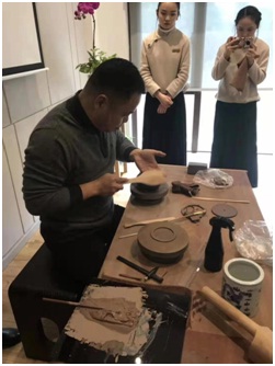 紫砂壺鑒賞和制作展示的相關(guān)內(nèi)容由國家級高級工藝美術(shù)師袁國強親自分享。他不僅介紹了紫砂壺制作的原材料、結(jié)構(gòu)以及如何辨別紫砂壺是否是手工制作等知識,還現(xiàn)場演示了紫砂壺制作過程中的手工拍打工藝,到場嘉賓近距離感受到了我國非物質(zhì)文化遺產(chǎn)的魅力。