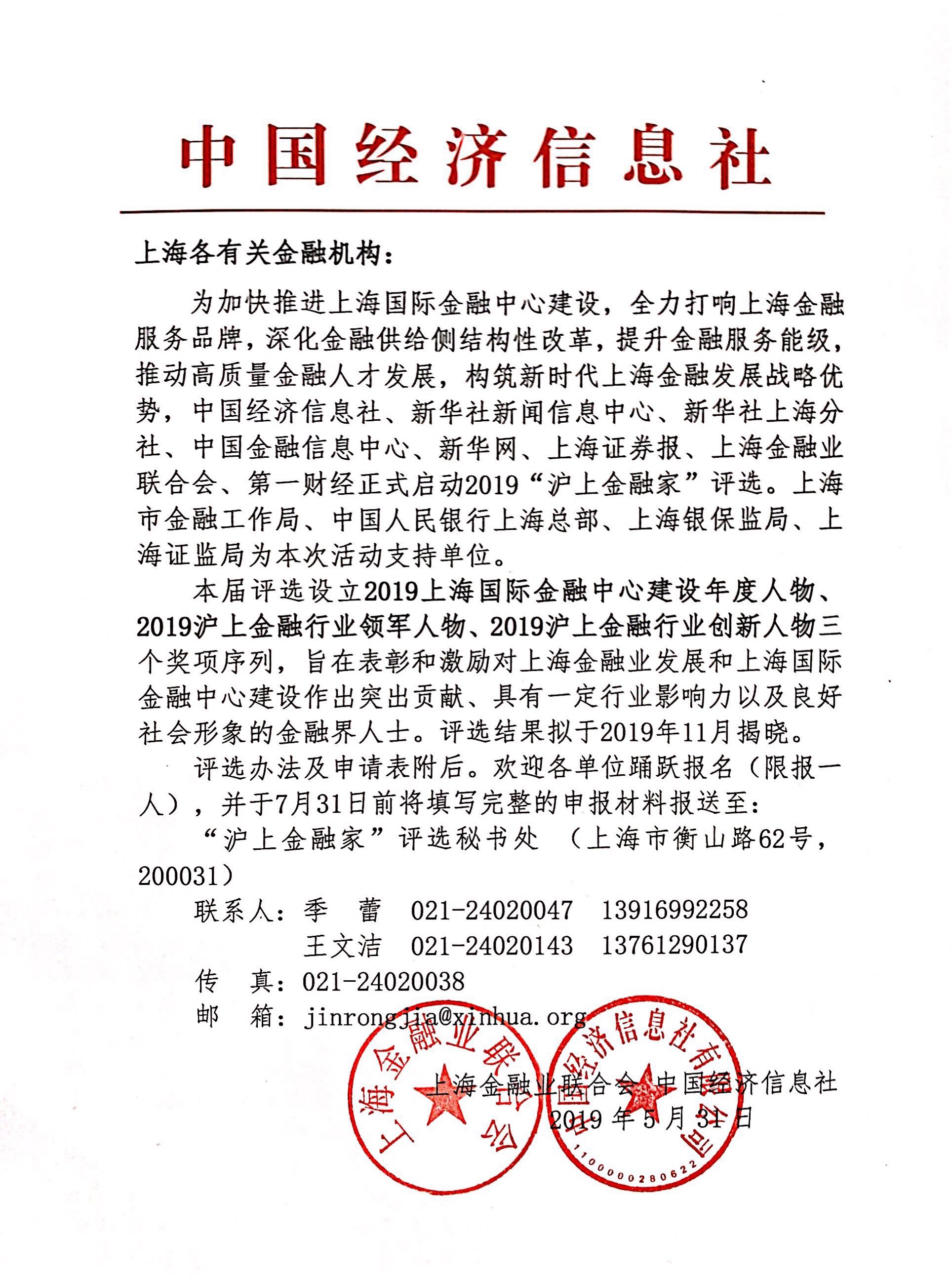 根據(jù)上海金融業(yè)聯(lián)合會及新華社中國經(jīng)濟信息社《2019“滬上金融家”評選通知》,2019“滬上金融家”評選工作已正式啟動。