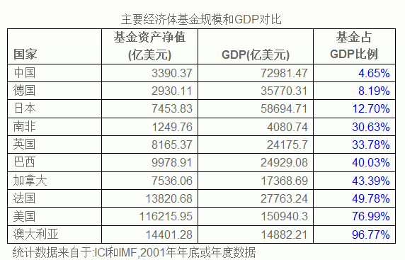 在主要發(fā)達(dá)國家中,德國和日本的基金占GDP比例略低一些,分別為8.19%和12.7%;澳大利亞和美國的占比較高,分別為96.77%和76.99%;中等發(fā)展水平的是法國英國和加拿大的30%至50%。