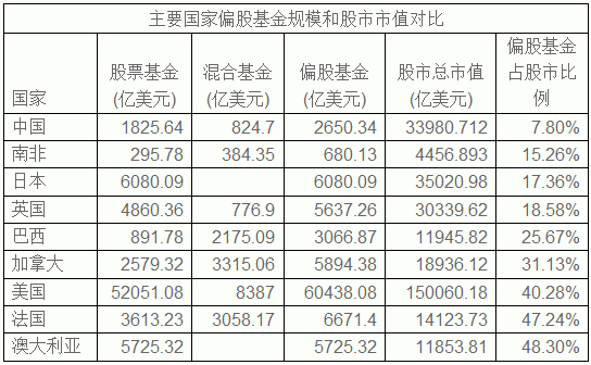 證券時報統(tǒng)計顯示,除中國以外的8個國家偏股基金平均占到了股市總市值的30.48%,比中國的這一指標(biāo)高出了2.9倍。若按照這些國家的平均水平計算,國內(nèi)基金業(yè)偏股基金有超過1萬億美元的市場空間。