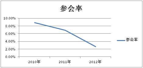 出席股東大會是機構投資者參與上市公司治理最直接有效的途徑,但問卷調查顯示,機構投資者參與股東大會的積極性卻不高,參會率極低。2010年至2012年三年間,上海102家上市公司共召開股東大會分別為233次、223次、227次,每家上市公司平均年召開股東大會2.26次;同期上市公司股東中的機構投資者平均數分別為53.08家,62.52家,198.49家,雖然機構投資者數量逐年上升,但股東大會的參會比例不升反降,機構投資者三年平均參會率僅為8.85%,6.88%,2.62%。