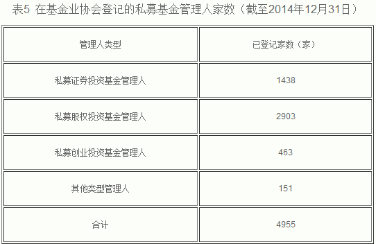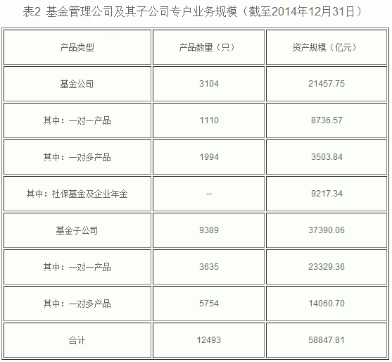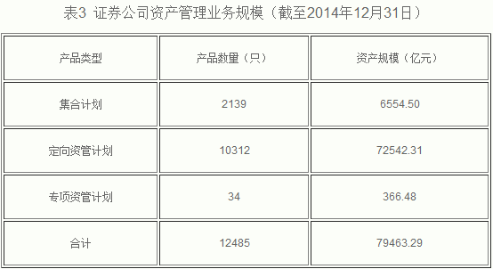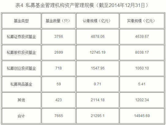 截至2014年12月31日,基金管理公司及其子公司、證券公司、期貨公司、私募基金管理機(jī)構(gòu)資產(chǎn)管理業(yè)務(wù)總規(guī)模約20.5萬(wàn)億元,其中,基金管理公司管理公募基金規(guī)模4.54萬(wàn)億元,基金管理公司及其子公司專戶業(yè)務(wù)規(guī)模5.88萬(wàn)億元,證券公司資產(chǎn)管理業(yè)務(wù)規(guī)模7.95萬(wàn)億元,期貨公司資產(chǎn)管理業(yè)務(wù)規(guī)模124.82億元,私募基金管理機(jī)構(gòu)資產(chǎn)管理規(guī)模2.13萬(wàn)億元。