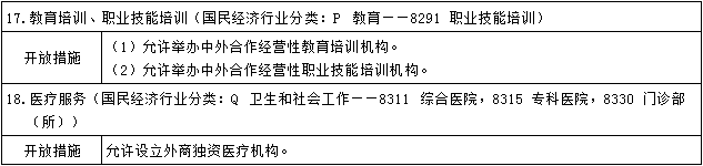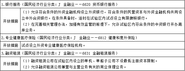 2.擴(kuò)大服務(wù)業(yè)開放。選擇金融服務(wù)、航運(yùn)服務(wù)、商貿(mào)服務(wù)、專業(yè)服務(wù)、文化服務(wù)以及社會(huì)服務(wù)領(lǐng)域擴(kuò)大開放(具體開放清單見附件),暫?;蛉∠顿Y者資質(zhì)要求、股比限制、經(jīng)營(yíng)范圍限制等準(zhǔn)入限制措施(銀行業(yè)機(jī)構(gòu)、信息通信服務(wù)除外),營(yíng)造有利于各類投資者平等準(zhǔn)入的市場(chǎng)環(huán)境。
