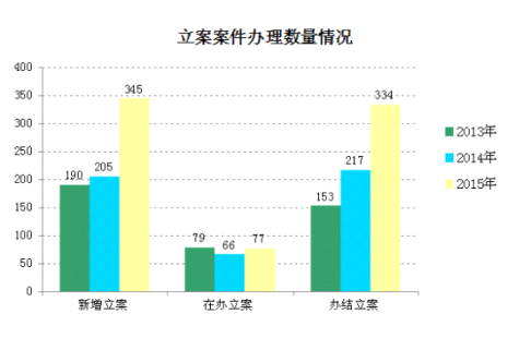 2015年1-12月,證監(jiān)會系統(tǒng)共受理違法違規(guī)有效線索723件,較上年增長明顯,新增立案案件共計345件,同比增長68%(近三年立案案件數(shù)量見下圖);新增涉外案件139起,同比增長28%;辦結(jié)立案案件334件,同比增長54%。立案案件調(diào)查周期平均為86天,較上年減少40天。累計對288名涉嫌當事人采取限制出境措施。凍結(jié)涉案資金共計37.51億元,金額為歷年之最。向公安機關(guān)移送案件55件,通報犯罪線索50余起。移交處罰審理案件273件,對767個機構(gòu)和個人作出行政處罰決定或行政處罰事先告知,同比增長超過100%,涉及罰沒款金額54億余元,超過此前十年罰沒款總和的1.5倍。案件查處數(shù)量持續(xù)攀升,查處周期大幅縮短,罰沒力度明顯增長,震懾效應明顯?!?/font>