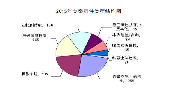 1-12月,證監(jiān)會繼續(xù)對內(nèi)幕交易、利用未公開信息交易保持高壓態(tài)勢,立案調(diào)查共計85起,對超比例持股立案調(diào)查53起,案件數(shù)量維持高位。積極踐行以信息披露為中心的監(jiān)管執(zhí)法理念,不斷加大對上市公司信息披露違規(guī)的打擊力度,對信息披露違規(guī)及證券期貨服務機構(gòu)違法違規(guī)立案調(diào)查共計61起,占比18%,同比增長53 %。針對影響市場秩序的突出問題,重點打擊懲處操縱市場案件,立案調(diào)查共計71起,案件數(shù)量創(chuàng)下近三年來新高,占比達到21%,同比增長373%,其中又以信息操縱、濫用程序化交易操縱、濫用融資融券操縱等新型操縱案件為重點。對非法經(jīng)營證券業(yè)務、非法咨詢立案調(diào)查24件,規(guī)范市場經(jīng)營秩序。首次將編造、傳播虛假信息、證券公司新三板違規(guī)開戶、私募基金違法違規(guī)等類型案件納入執(zhí)法視野,并積極發(fā)揮個案輻射效應,規(guī)范資本市場信息傳播秩序,規(guī)范新三板市場運行,保護投資者合法權(quán)益,達到“以點帶面”的打擊效果(2015年立案案件類型結(jié)構(gòu)見下圖)。