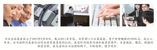 興業(yè)全球基金成立于2003年9月30日,截止2011年年底,共管理11只公募基金,資產(chǎn)管理規(guī)模約350億元。成立八年來,公司始終對基金行業(yè)的本質(zhì)有著清楚的認識,在實際的經(jīng)營活動和投資管理中,本著誠信、規(guī)范、穩(wěn)健的經(jīng)營方針,在完善的公司治理結(jié)構(gòu)下,不斷創(chuàng)新,穩(wěn)步前行。