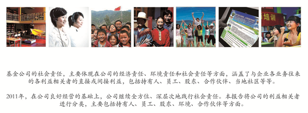 2011年,在公司良好經(jīng)營的基礎(chǔ)上,公司繼續(xù)全方位、深層次地踐行社會責(zé)任。本報告將公司的利益相關(guān)者進行分類,主要包括持有人、員工、股東、環(huán)境、合作伙伴等方面。