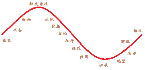 在一個(gè)完整的股市周期中,投資者的心理也會(huì)呈現(xiàn)出周期性波動(dòng)(如下圖)。例如,某投資者三年前還對股市極度樂觀,但隨著股市的下跌,一年內(nèi)就迅速轉(zhuǎn)變?yōu)橄麡O甚至于悲觀失望了。