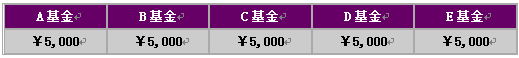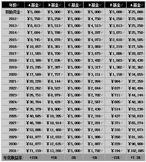 讓我們來(lái)看看分散投資會(huì)怎么樣。我們把25000資金五等分,相當(dāng)于每個(gè)基金投進(jìn)去5000塊。那我們的投資組合應(yīng)該如下:
