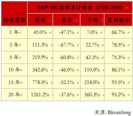 由于我國股市時間尚短,不能完全展示出長期投資的效果,故我們將美國S&P 500指數(shù)80年來的數(shù)據(jù)進行了整理和計算。從上圖我們可以明顯看出,在持有股票期限1年的情況下,投資者獲利的概率為66.7%,而如果持有15-20年,盈利概率增加至90%。如果持有時間為15-20年,則總共虧損的案例僅有3個,而那還是由于在1929-1933年大蕭條之前的高點買入所致。當持有時間超過3年后,盈利的概率逐步增加。如果我們懂得在股市整體被低估的情況下買入,效果將更為明顯。