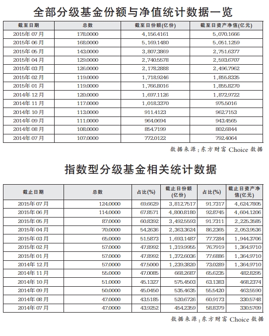 據東方財富Choice資訊數據統(tǒng)計,2014年7月,指數型分級基金的資產規(guī)模還只有330.57億元,在整個分級基金中占比為41.72%,一年后,該類產品的資產規(guī)模已經飆升至4624.78億元,增長了近13倍,在整個分級基金中占比已經高到91.22%。