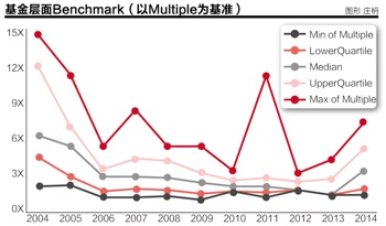 在基金業(yè)績層面,以IRR作為基本標(biāo)桿,我們可以看到自2004以來至2014年,行業(yè)的中位數(shù)基本高于25%的年化內(nèi)部收益率,而優(yōu)秀基金(前25%)的業(yè)績水平要高于30%。這一業(yè)績水平,要遠(yuǎn)遠(yuǎn)高于傳統(tǒng)的投資手段,確實體現(xiàn)出了PE行業(yè)的高收益特征。