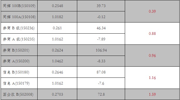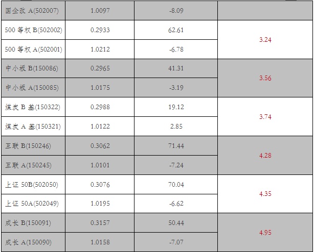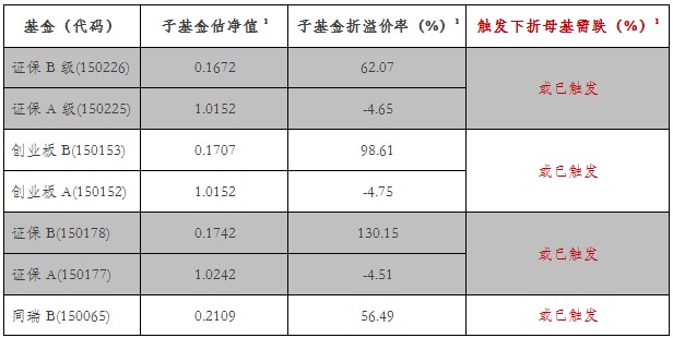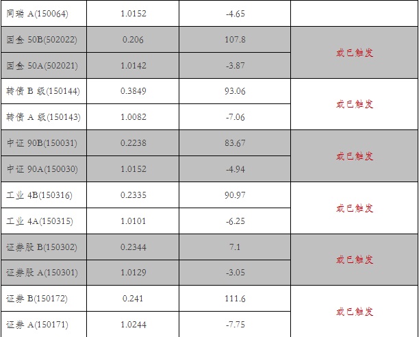 特別提示:根據(jù)金思維估凈值,以下10只分級(jí)基金:證保B級(jí)(150226)/證保A級(jí)(150225)、創(chuàng)業(yè)板B(150153)/創(chuàng)業(yè)板A(150152)、證保B(150178)/證保A(150177)、同瑞B(yǎng)(150065)/同瑞A(150064)、國(guó)金50B(502022)/國(guó)金50A(502021)、轉(zhuǎn)債B級(jí)(150144)/轉(zhuǎn)債A級(jí)(150143)、中證90B(150031)/中證90A(150030)、工業(yè)4B(150316)/工業(yè)4A(150315)、證券股B(150302)/證券股A(150301)、證券B(150172)/證券A(150171)已觸發(fā)下折。具體下折與否以基金公告為準(zhǔn)。