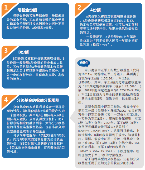 分級(jí)基金是通過(guò)基金收益分配的安排,將基金份額分成預(yù)期收益與風(fēng)險(xiǎn)不同的幾類份額,并將其中一類份額或兩類份額上市進(jìn)行交易的結(jié)構(gòu)化證券投資基金。一般而言,分級(jí)基金區(qū)分為三類份額,按照不同的收益分配原則,三類份額的風(fēng)險(xiǎn)收益特征也具有明顯差別。
