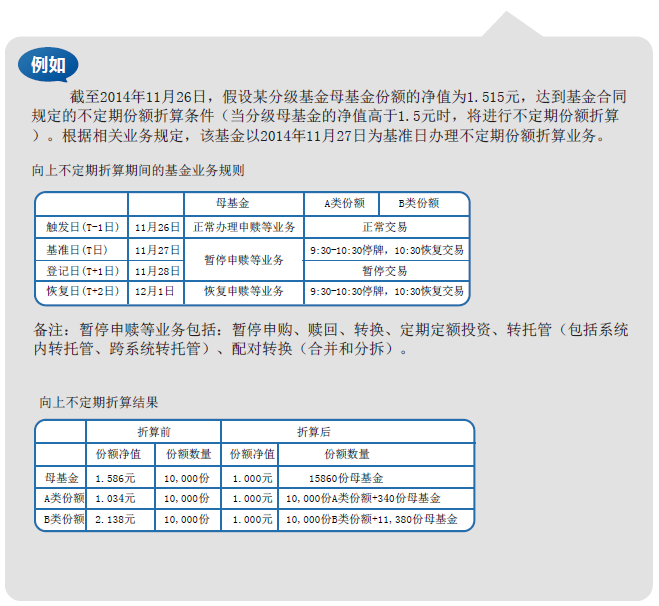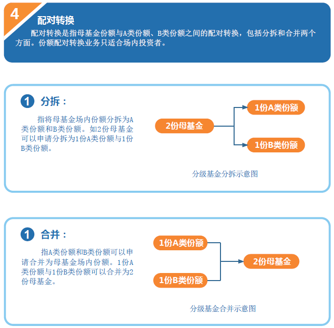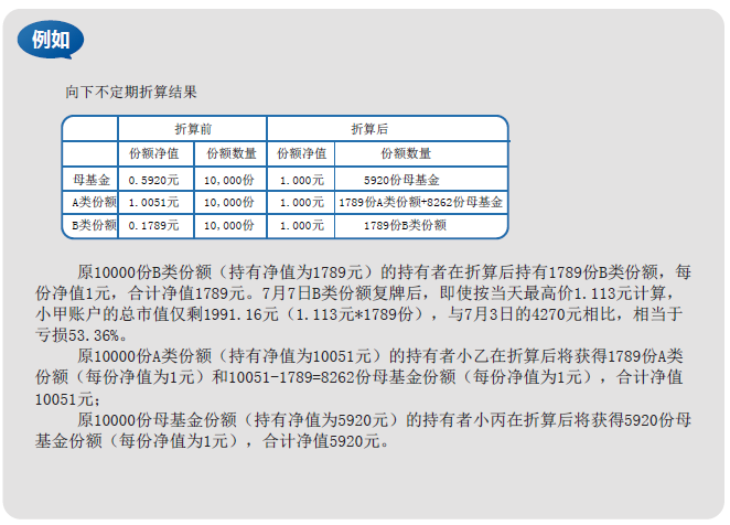 A類份額和B類份額只能是整數(shù)份額,所以,分拆只能拆偶數(shù)份的母基金,而合并也只能是合成整數(shù)份的母基金。