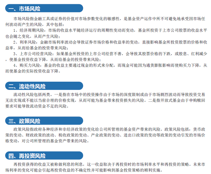 分級(jí)基金面臨的風(fēng)險(xiǎn)主要有:市場(chǎng)風(fēng)險(xiǎn)、流動(dòng)性風(fēng)險(xiǎn)、政策風(fēng)險(xiǎn)、再投資風(fēng)險(xiǎn)、指數(shù)投資相關(guān)風(fēng)險(xiǎn)、基金運(yùn)作的特有風(fēng)險(xiǎn)、信用風(fēng)險(xiǎn)、道德風(fēng)險(xiǎn)、營(yíng)運(yùn)風(fēng)險(xiǎn)、管理風(fēng)險(xiǎn)和其他風(fēng)險(xiǎn)