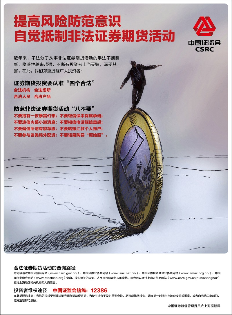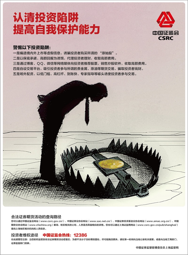 為進一步拓展宣傳渠道,擴大活動覆蓋面,提升宣傳效果,公會現(xiàn)向各會員單位下發(fā)由上海證監(jiān)局、上海市基金同業(yè)公會聯(lián)合制作的《防范非法證券期貨活動宣傳教育海報》,會員單位須高度重視此項活動,盡快派相關(guān)人員至公會秘書處領(lǐng)取,并將宣傳材料通過現(xiàn)場張貼、活動發(fā)放、公司網(wǎng)站、微信公眾號等各類渠道進行廣泛宣傳教育,幫助投資者識別防范非法證券期貨活動,切實保護投資者合法權(quán)益。