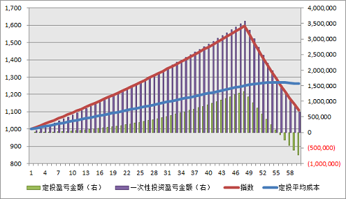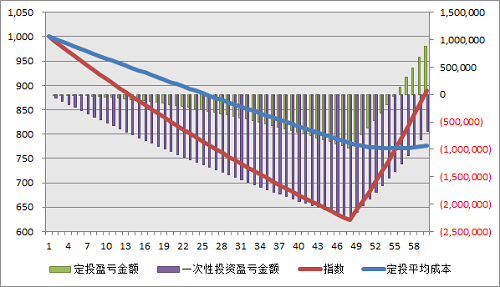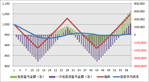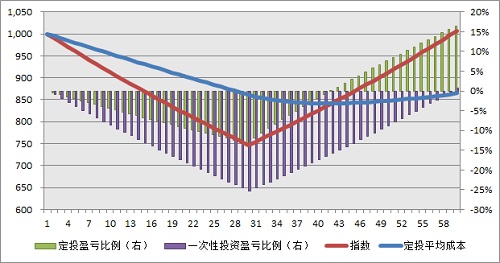 指數(shù)先跌后漲,五年累計收益接近0,因此一次性投資于五年末不賺不虧。由于前三年指數(shù)下跌,定投的成本不斷下降。三年后指數(shù)反彈,但只要指數(shù)點位低于平均成本,平均成本仍然在下降,最后平均成本稍有上升,但由于指數(shù)一直處于初始點位(1000)之下,最終的平均成本遠低于一次性投資。此輪比較中,一次性投資五年收益接近于無,而定投獲得了16%的回報。