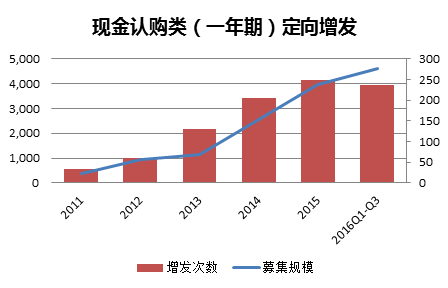 據(jù)基金業(yè)協(xié)會公示的基金專戶產(chǎn)品統(tǒng)計,前三季度,已成立的名字中包含“定增”字樣的基金專戶產(chǎn)品數(shù)量為854個,平均每天成立3.1戶。同期,16只公募定增基金成立,募集總規(guī)模271億元,涉及10家基金公司。而去年僅僅成立4只公募定增基金,規(guī)模63億。