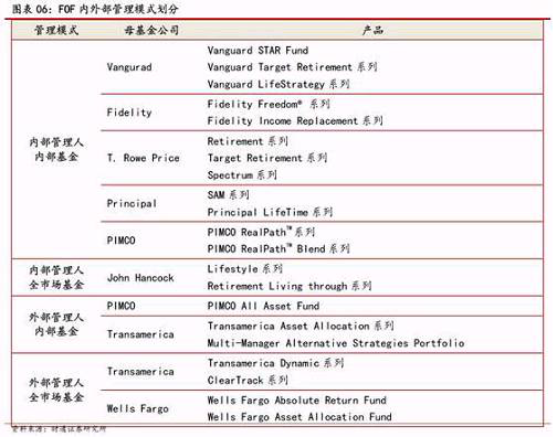 采用這種管理模式的FOF由基金公司自有團(tuán)隊(duì)負(fù)責(zé)基金投資策略的設(shè)定和投資組合的構(gòu)建,且子基金的篩選對(duì)象亦是基金公司已發(fā)行的產(chǎn)品。發(fā)行這種形式FOF的通常是大型基金公司,旗下的基金類型豐富、覆蓋面廣泛,能夠有效地構(gòu)建大類資產(chǎn)配置,例如Vanguard、Fidelity、T.Rowe Price等。