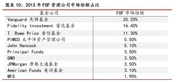 ?。?)從參與公募FOF的機(jī)構(gòu)分布來看,行業(yè)鏈條中既有具有覆蓋全產(chǎn)業(yè)鏈的大型基金公司,如先鋒、富達(dá)、普信,三者占據(jù)了FOF近一半的市場(chǎng)份額;也產(chǎn)生了晨星和GMO等專業(yè)投資顧問類機(jī)構(gòu);還有一些由于內(nèi)部投研實(shí)力欠佳但渠道優(yōu)勢(shì)較強(qiáng)而采用全外包模式的機(jī)構(gòu),如銀行、保險(xiǎn)公司等這類行業(yè)整合者。