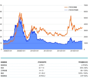 還是以滬深300的歷史市盈率為例(數(shù)據(jù)取自2005年4月8日至2017年2月24日),其平均值為17.5,中位數(shù)為14.