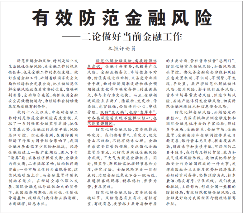 在第五次全國(guó)金融工作會(huì)議之后,各大金融研究機(jī)構(gòu)和各類媒體迅速跟進(jìn),全方位的解讀與全行業(yè)的呼應(yīng)都讓人應(yīng)接不暇。其中《人民日?qǐng)?bào)》在頭版刊發(fā)的社論《有效防范金融風(fēng)險(xiǎn)》中“灰犀?!币辉~,更是引發(fā)了全市場(chǎng)的討論。
