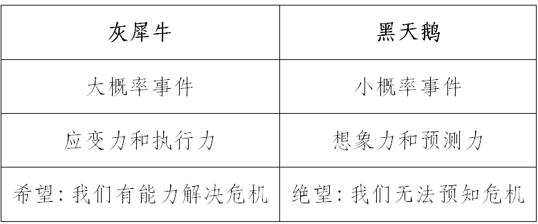 灰犀牛與黑天鵝可以理解為以下相對(duì)的概念: