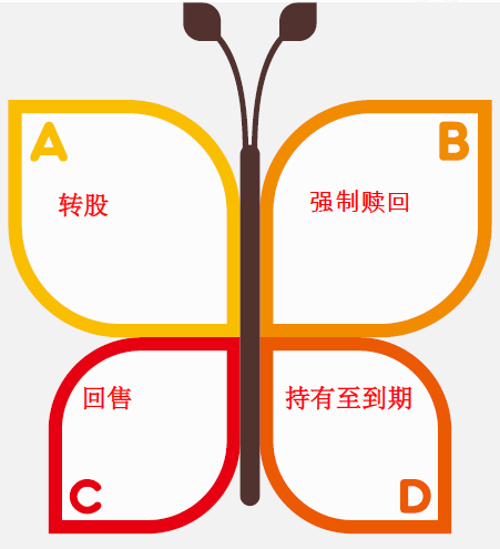由于可交換債的條款比較復(fù)雜,在不同情況下其收益也是不同的。不考慮違約的話,大體上可以分為轉(zhuǎn)股、強(qiáng)制贖回、回售和持有到期四種情況,如下圖所示。