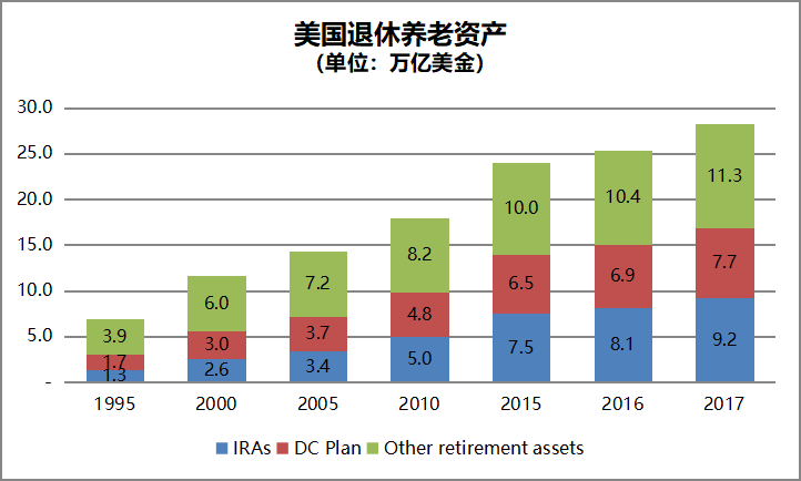 我們從美國的退休養(yǎng)老數(shù)據(jù)來看,截至2017年底,我國現(xiàn)在積極發(fā)展的商業(yè)養(yǎng)老產(chǎn)品就類似美國的個(gè)人退休養(yǎng)老賬戶(IndividualRetirement Account,IRA),其規(guī)模超過9.2萬億美金,占退休養(yǎng)老資產(chǎn)的32.62%。