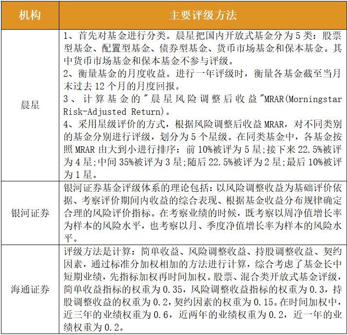 基金評(píng)級(jí)基本原理是利用基金的業(yè)績(jī)數(shù)據(jù),考慮到風(fēng)險(xiǎn)等因素為基金做整體的排名,但是每個(gè)評(píng)級(jí)機(jī)構(gòu)的標(biāo)準(zhǔn)和方法不盡相同,以下我們列舉了晨星、銀河證券、海通證券三家評(píng)級(jí)機(jī)構(gòu)的主要評(píng)級(jí)方法,供大家參考。