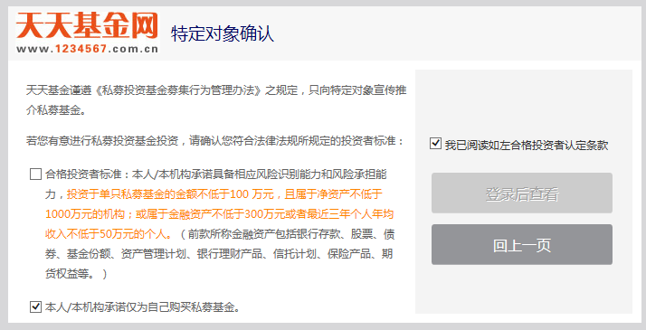 而私募基金只向合格投資者進行發(fā)售,法律規(guī)定,私募不能通過公開宣傳來募資,所以投資者很難通過媒體等方式了解私募產(chǎn)品,一般只有合格投資者才能接觸到具體的產(chǎn)品信息。比如在天天基金網(wǎng)上點擊“私募產(chǎn)品”欄目的時候,就會彈出以下提示。