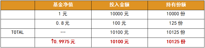 比如說:基金凈值為1時(shí)買入10000元,此后基金凈值下跌,在0.8元時(shí)按照原投入金額的1%進(jìn)行補(bǔ)倉(cāng)(也就是100元),那么基金凈值要上升到0.9975元以上時(shí)才能回本,與原持有成本并無太大差異。
