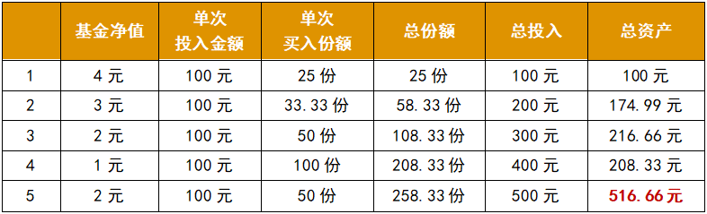 在基金價(jià)格為4元的時(shí)候開始定投,每期投入100元,5期成本共500元。共計(jì)持有258.33份,按照末期凈值2元時(shí)贖回,就已經(jīng)獲得盈利。