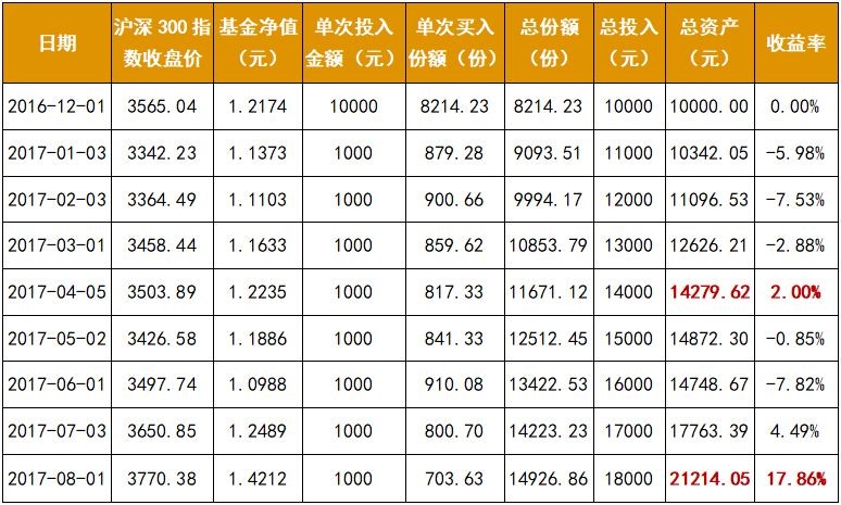 從上表中我們可以看到,在經(jīng)過4期定投之后,在2017年4月5日時(shí),滬深300指數(shù)仍然低于第一次投入時(shí)(2016年12月1日)的點(diǎn)位,但是該投資者總資產(chǎn)金額已經(jīng)高于投入成本,實(shí)現(xiàn)收益2.00%。如果繼續(xù)定投,8期之后,在2017年8月1日時(shí),可實(shí)現(xiàn)收益17.86%。