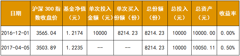 如果該投資者沒有選擇定投補(bǔ)倉(cāng),到2017年4月5日時(shí),則收獲0.50%的收益,低于定投4期后的2.00%收益。