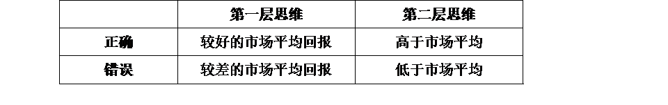 下表用四種情況展現(xiàn)了不同思維下的決策結(jié)果。如果你保持共識(shí)性的第一層思維,至少不會(huì)犯錯(cuò)。但如果你用第二層思維來決策,又不幸思考錯(cuò)了的話,就可能面臨低于市場平均收益的結(jié)果。只有當(dāng)你的判斷高人一等時(shí),才能獲得高于市場平均的收益。