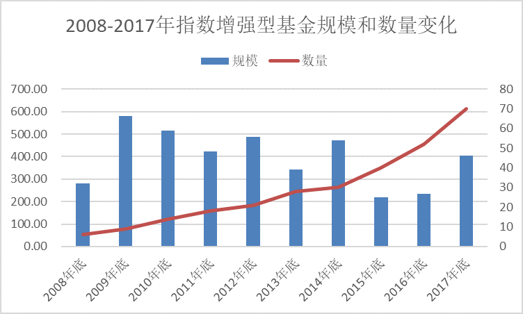指數(shù)增強(qiáng)型基金自初創(chuàng)以來就深受投資者親睞,但在國內(nèi)一直算是一個(gè)比較小眾的產(chǎn)品,市場(chǎng)上指數(shù)增強(qiáng)型基金的數(shù)量并不多,遠(yuǎn)遠(yuǎn)低于被動(dòng)管理的普通指數(shù)型基金,根據(jù)choice統(tǒng)計(jì)2008年至2017年,指數(shù)增強(qiáng)型基金的總數(shù)一共是77只,每年穩(wěn)步增加,截止至2018年一季度的管理規(guī)模為423億,歷史每年管理規(guī)模隨當(dāng)年A股行情波動(dòng)比較明顯: