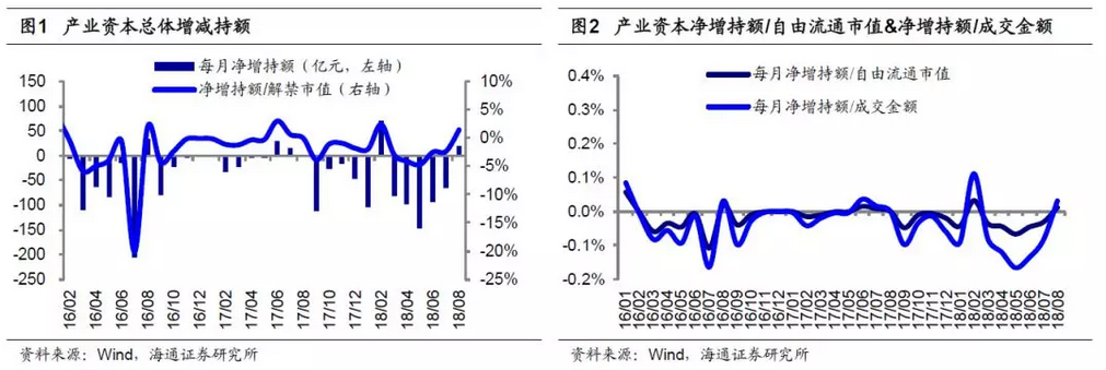 從相對(duì)規(guī)模上看,8月產(chǎn)業(yè)資本凈增持額/解禁市值為1.47%,2016年以來均值為-1.80%,凈增持額/成交金額為0.03%,2016年以來均值為-0.04%,凈增持額/自由流通市值為0.01%,2016年以來均值為-0.02%。(數(shù)據(jù):wind,海通證券研究所)