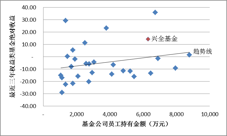 基金公司員工持有金額較多是不是就意味著他們旗下的基金業(yè)績越好?從數(shù)據(jù)上來說,是的。根據(jù)截至2018年6月30日的數(shù)據(jù),主動偏股型基金口徑下,比較基金公司員工持有金額超過千萬的公司,和其最近三年權(quán)益類基金絕對收益,可以明顯看到,整體呈現(xiàn)正相關(guān)。其中,興全基金以員工持有金額排名行業(yè)第6,最近三年權(quán)益類基金絕對收益排名8/81,表現(xiàn)相對突出。