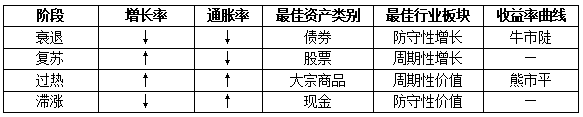 主要是根據(jù)經(jīng)濟(jì)增長(zhǎng)趨勢(shì)(產(chǎn)出缺口)和通貨膨脹趨勢(shì)(CPI),將經(jīng)濟(jì)周期劃分為四個(gè)階段:衰退、復(fù)蘇、過熱、滯漲。在不同階段的經(jīng)濟(jì)周期變換時(shí),債券、股票、大宗商品和現(xiàn)金依次有超過整體市場(chǎng)的表現(xiàn)。