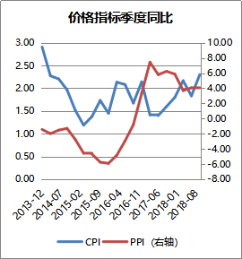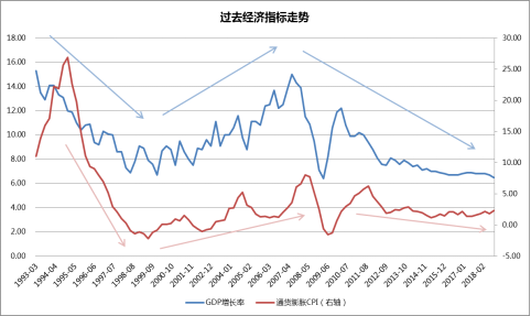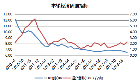 從近期主要經(jīng)濟(jì)指標(biāo)的邊際變動(dòng)來看,經(jīng)濟(jì)確實(shí)在下行,GDP、工業(yè)增加值在2016年底至2017年中有一波上行,但今年以來邊際上持續(xù)回落;同時(shí),代表工業(yè)價(jià)格的PPI也在2017年見到高點(diǎn)后持續(xù)下行;通脹保持穩(wěn)定區(qū)間,今年以來消費(fèi)者物價(jià)指數(shù)(CPI)保持平穩(wěn)向上,但從過往三輪經(jīng)濟(jì)周期的經(jīng)驗(yàn)來看,通脹增速平均落后于經(jīng)濟(jì)增速一年左右,相信未來通脹幅度仍在可預(yù)期之間。