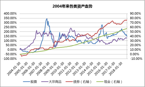 我們?cè)偌尤敫黝愘Y產(chǎn)的變動(dòng)來看,分別以滬深300指數(shù)、中證國(guó)債指數(shù)、Wind貨幣基金指數(shù)及Wind商品指數(shù)代表股票、債券、現(xiàn)金及大宗商品的走勢(shì)。2007年以來截至2018年10月23日,在GDP增長(zhǎng)率、CPI雙降的大趨勢(shì)下,股票、債券、現(xiàn)金及大宗商品的收益率分別是55.97%、54.77%、47.39%及-12.35%,也不能與美林時(shí)鐘的邏輯完全匹配。
